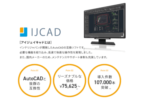 IJCAD(アイジェイキャド)はインテリジャパン社が開発した、AutoCADの互換CADです。必要な機能に絞り込み、高速で快適な操作性を実現しました。3種のグレードおよび3種のライセンス形態から選択することができ、幅広いユーザーの利用シーンに対応します。