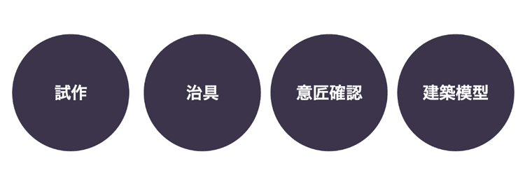 企業の業務用3Dプリンターの活用用途としては、「試作」「治具」「意匠確認」「建築模型」などが挙げられます。
