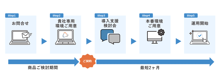 ご提案時から実際の運用を想定した専用環境をご用意するため、より具体的なイメージでご検討いただけます。無料トライアル期間が60日間あり、導入後も専任SEが支援するため安心です。