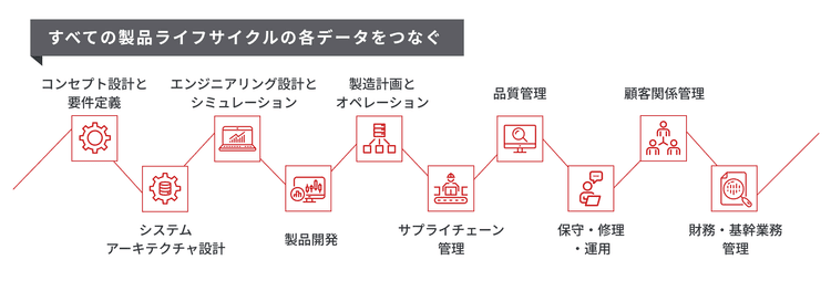 過去の設計データや納品後の顧客の声を新たな製品開発に利用したり、サービス部門が設計や製造の情報を利用して、予防的メンテナンスを適切に実施したりできるようになります。