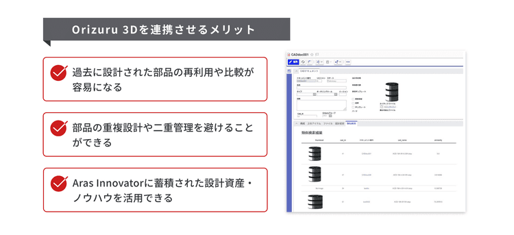 Aras InnovatorとCCTが開発したOrizuru 3Dを連携して、3D類似検索機能を追加し、Aras Innovatorに眠る過去のノウハウを活用することができます。