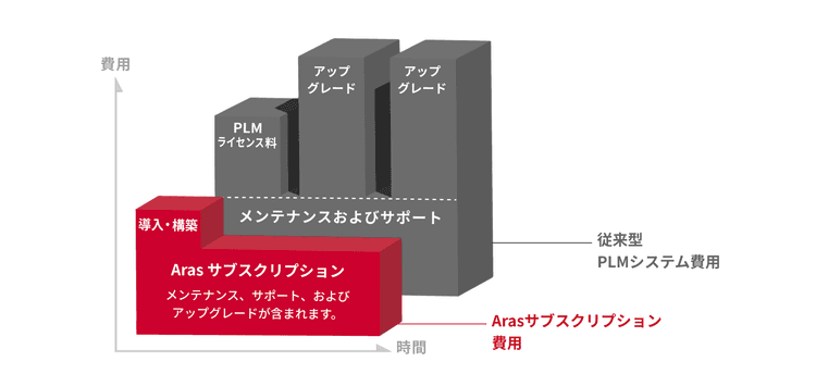 サブスクリプションサービスには、標準機能だけでなくカスタマイズ開発機能も対象としたAras社によるバージョンアップサービスが含まれるため、他PLM製品と比べて、バージョンアップ時に改修コストを削減することができます。