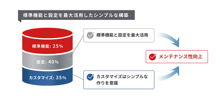 全機能のうちの65%を標準機能と設定でできる範囲で実現しました。標準機能と設定を最大活用しながら、業務に寄り添う形で必要最小限のカスタマイズを行いました。