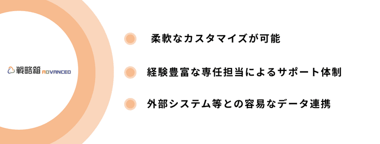 戦略箱の特徴の一つは、柔軟なカスタマイズが可能です。運用に合わせた細かなカスタマイズから、自社の業務に特化した要件に対応できるよう、戦略箱は柔軟なカスタマイズを提供しています。