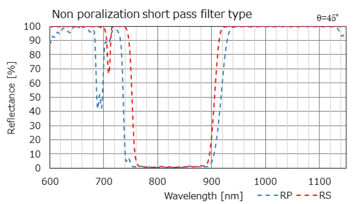光源からのP,Sの偏光成分の影響を受けないショートパス型のダイクロイックミラーです。反射帯域ではP偏光を高反射、透過帯域ではS偏光も高透過とできる事が特徴です。