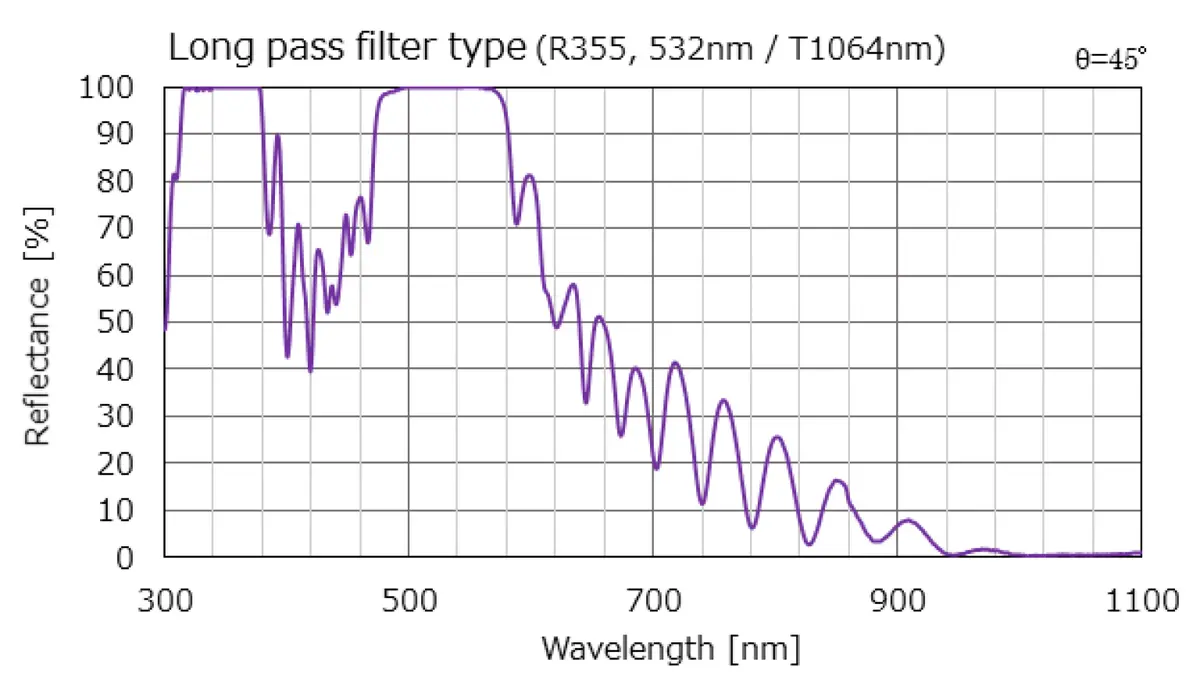レーザー光源の主波長1064nmを全透過させ、高調波を全反射させた特性例。レーザー光源波長の有効活用に効果を発揮します。