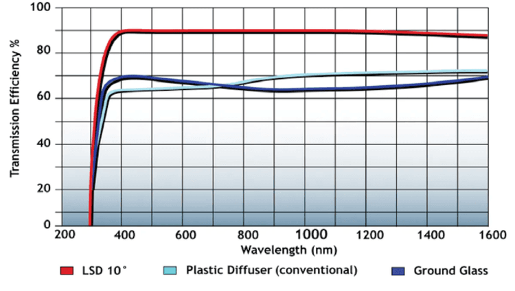 LSDは400nm~1100nmの波長域で85~92%という非常に高い透過率を実現可能であり、光源の光を無駄にすることなく効率的に利用できます。