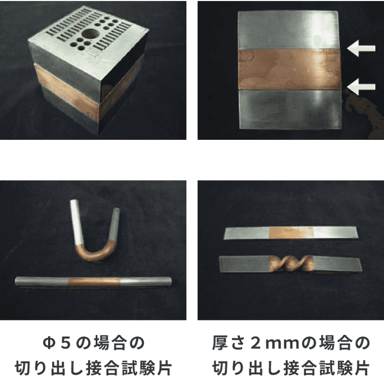 異種金属同士を接合することで、電導性、熱伝導性、磁性、比重等など、新しい特性を持った複合材や新素材の開発が可能です。