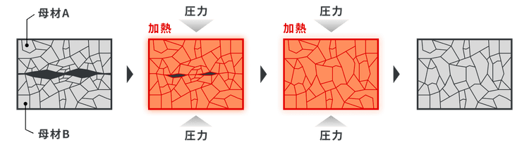 簡単に説明すると、「金属同士を密着させ、金属が溶けない程度の高温状態で圧力をかけることで、金属表面同士を接合させる」方法です。