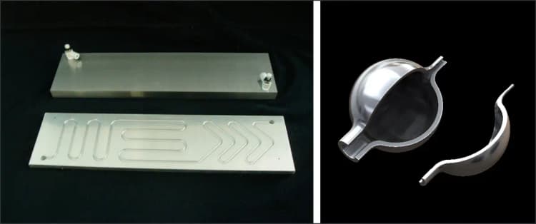 あらかじめ貫通穴や溝を掘った母材同士を接合することにより、複雑な構造を持つ中空部品の製造を可能にします。