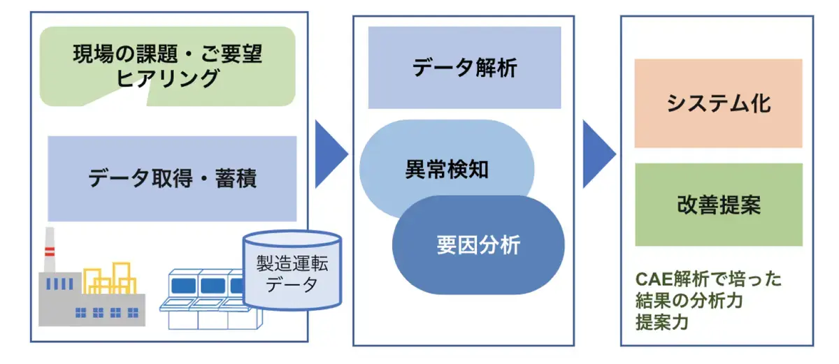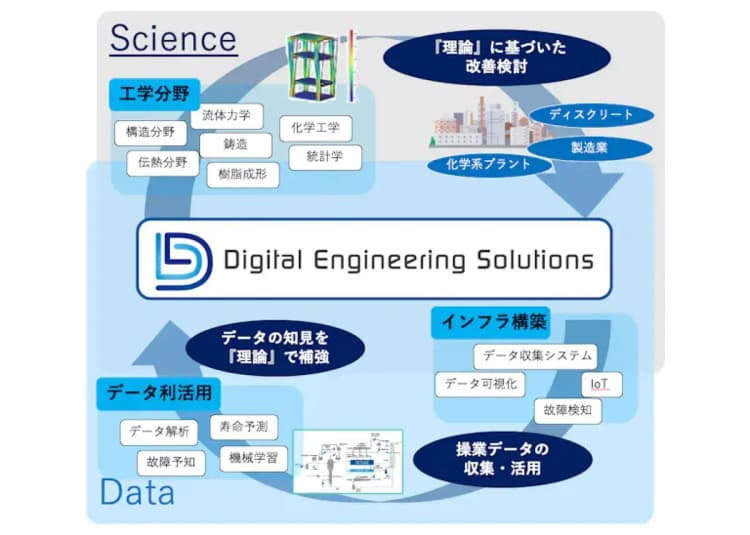 デジタルエンジニアリングソリューションとは、「物理モデルシミュレーションを用いた工学的な解析」「PI Systemを軸とするインフラ構築」「データ解析・利活用サービス」をトータルでご案内できるソリューションです。