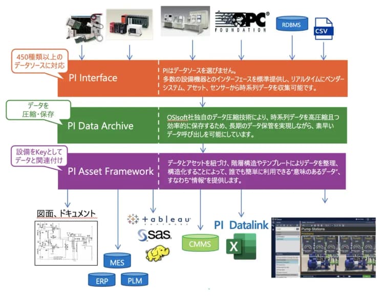 「PI System」は、操業データ(生産実績、品質情報、設備稼働率など)をリアルタイムに見える化・共有化するための、リアルタイムデータ管理システムです。電力やガス、石油、化学、製造業等を中心に幅広く利用され、様々な設備やセンサーの時系列データを収集し、活用するためのプラットフォームとし、グローバルスタンダードとしてワールドワイドで多くの企業に採用されています。