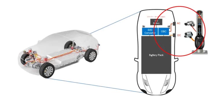 EV用OBC(オンボードチャージャー)は、主に充電スタンドから供給される交流電力を直流に変換し、バッテリーに充電する役割を担っています。