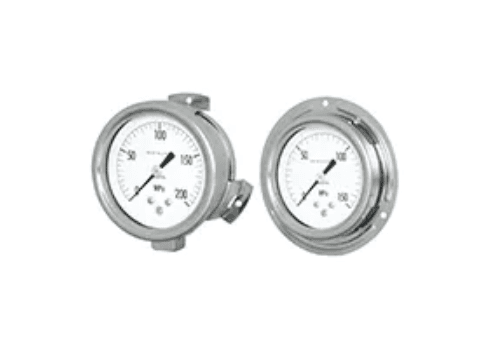 安全性が高く耐久性に優れる圧力計で、ソリッドフロント(前壁式)ケースの採用により、万一の圧力エレメント破損時には、圧力を計器裏面の裏板より排除する構造となっています。