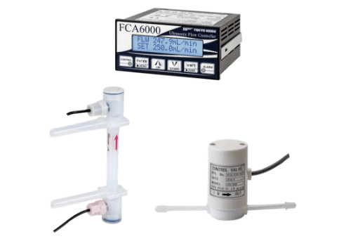 | 流量コントロールシステム FC6000 | PFA製UCUF形超音波流量計とFCV形コントロール弁を備えたFCA6000形コントローラによる分離型流量コントローラです。広範囲の流量制御が可能で、純水や薬液、CMPスラリーなどに使用可能です。 |