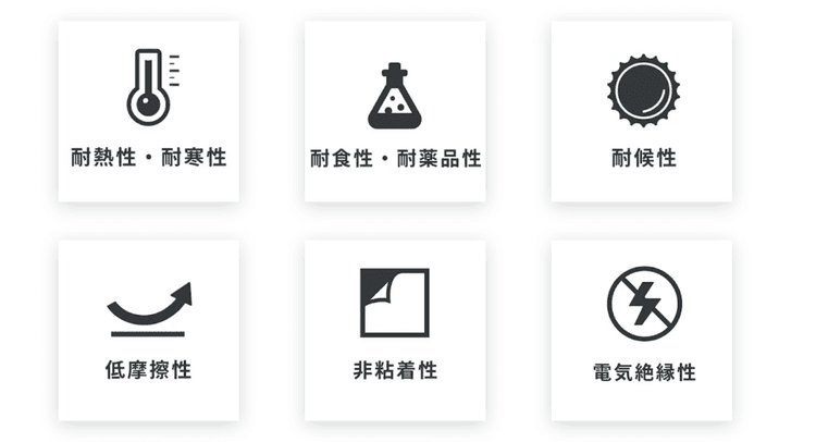 耐熱性、耐薬品性、耐候性、低摩擦性、電気絶縁性など優れた特性を持ち、さまざまな産業や製品に広く利用されています。