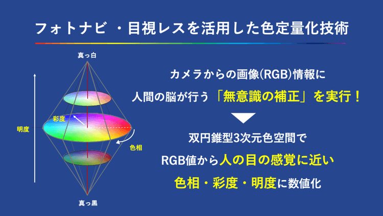 フォトナビ ・目視レスを活用した色定量化技術は、双円錐型3次元色空間を用いて、物体の色を、RGB値から人の目の感覚に近い色相・彩度・明度に数値化します。