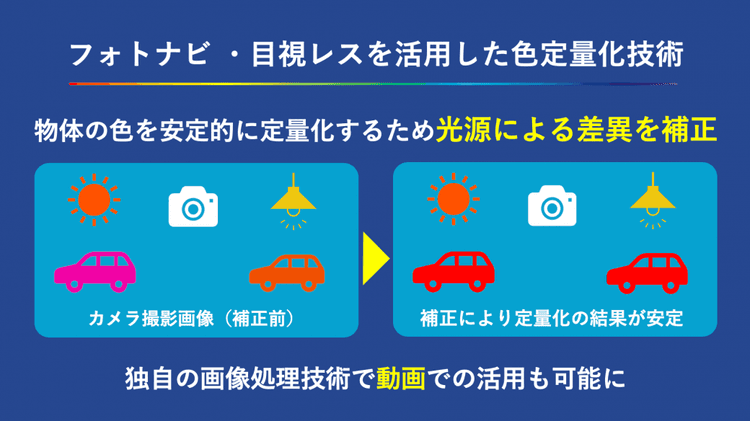 使用するカメラコントロールを含めた独自の画像処理技術によって、異なる条件でも物体の色を安定的に測定することができます。さらにこの技術を応用し、静止画のみならず動画での活用も可能です。
