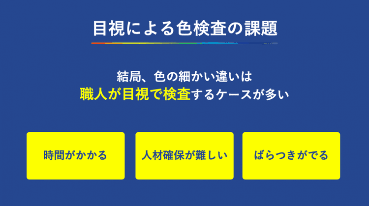 結局、色の細かい違いは職人が目視で検査する以外、良い方法がありませんでした。しかし、職人による目視検査では、「時間がかかる」「人材の確保確保が難しい」「人によってばらつきがでてしまう」などの課題があります。
