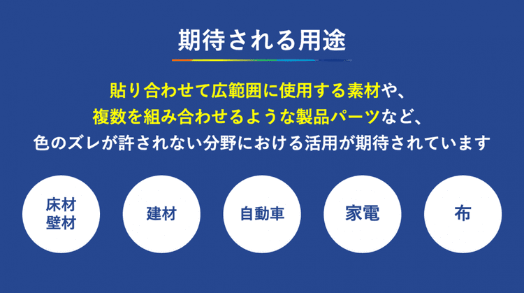 貼り合わせて広範囲に使用する素材や、複数を組み合わせるような製品のパーツなど、 色のズレが許されない分野における活用が期待されています。