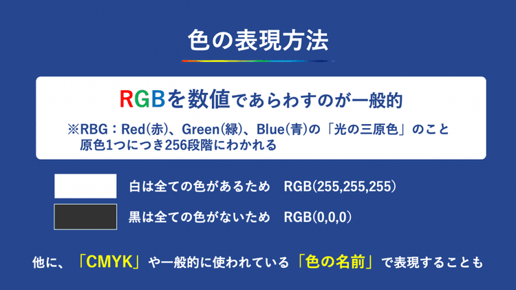 色の表現方法にはいくつか種類がありますが、RGBという光の三原色での表現が一般的です。RGBとはRedのR、GreenのG、BlueのBを組み合わせたもので、これらの原色1つにつき256段階で表すことができます。RGBの他に色の三原色と黒をあわせた「CMYK」や、一般的に使われている「色の名前」で色を表現することもあります。