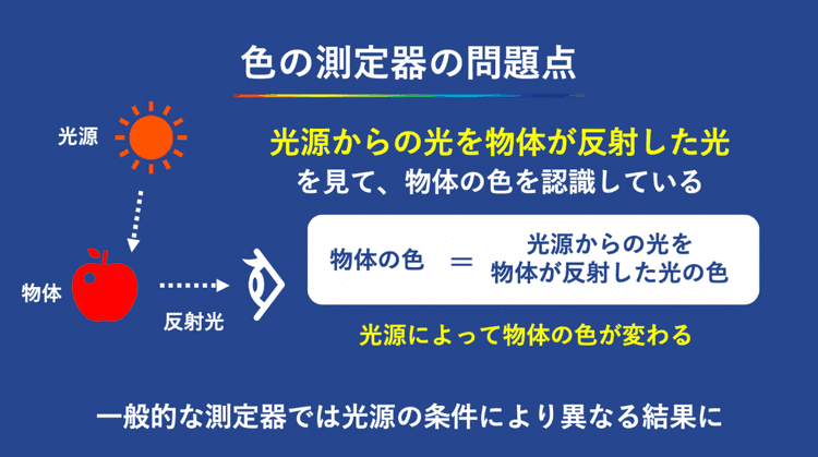 一般的な色の測定器では、この光源の条件の違いにより、同じ物体でも異なる測定結果が出てしまいます。