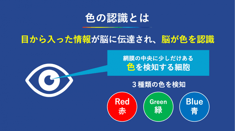 色は、目から入った色に関する情報が脳に伝達されることで、脳で認識されます。具体的には、眼球の網膜の中央付近にある細胞が「赤」「緑」「青」の色をそれぞれ検知し、その情報を脳に送ります。