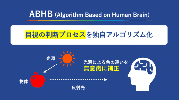「色の定量化」における課題を解決した技術が、フォージビジョン株式会社のABHBという独自アルゴリズムです。ABHBとは、アルゴリズム・ベースド・オン・ヒューマン・ブレインの略で、フォージビジョンが目視の判断プロセスを独自にアルゴリズム化した技術です。