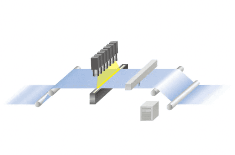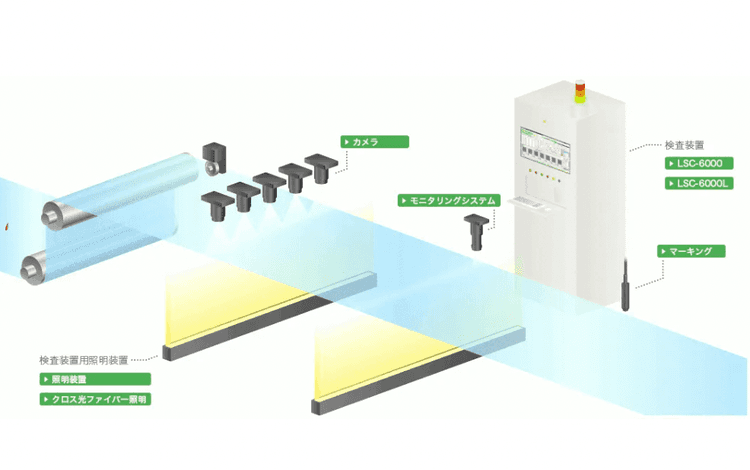 被検査対象(フィルム、金属等)に照明を照射(透過または反射)し、欠陥箇所で発生する光のコントラスト差をリアルタイムにラインセンサーカメラで検出するシステムです。