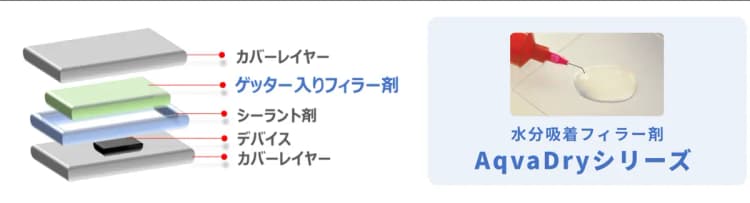 熱硬化またはUV硬化型の接着剤で、パッケージエッジ部に使用することでデバイスへの水分侵入を防ぎ、デバイスの長期信頼性を保ちます。