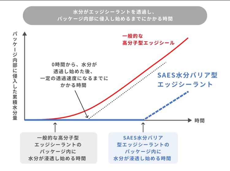 SAESの水分バリア型エッジシーラントの場合、水分がパッケージ内部に侵入し始めるまでの時間を可能な限り長くすることで、パッケージ内部への水分浸入を長期に渡って防止。