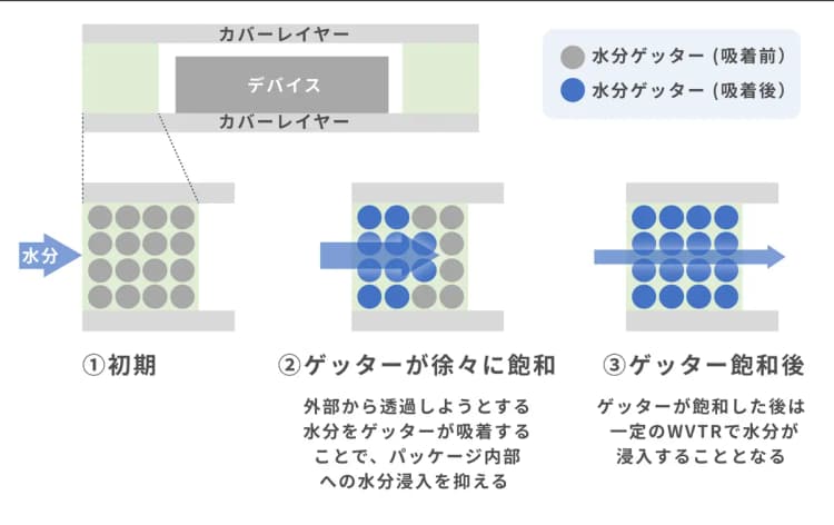 - 外部から透過しようとする水分をゲッターが吸着することで、パッケージ内部への水分侵入を長期にわたって防止し、デバイスの長期安定性やライフを改善。