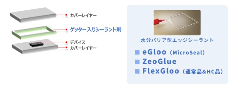 特徴 | ナノサイズのゲッター粒子により極小ギャップ(数10μm単位)のパッケージに対応可能。 ※その他のシーラント剤は数100μm単位のギャップが必要 |