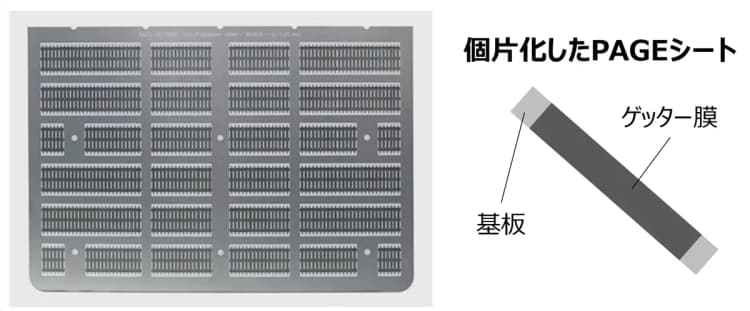 PAGEゲッターシリーズは、リッドやウエハ、金属箔上にゲッターを成膜した製品で、スペースが非常に限られたパッケージでの使用に適しています。また300℃/15分という比較的低温・短時間の条件で活性化できることも大きな特徴です。