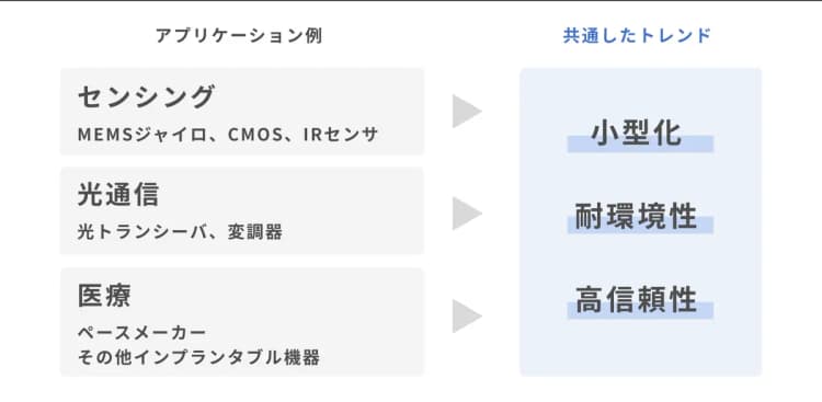 近年、センシング(MEMSジャイロ、CMOS、IRセンサ)、光通信(光トランシーバ、変調器)、医療(ペースメーカー、その他インプランタブル機器)など、様々なアプリケーションにおける電子機器の用途の広がりに伴い、デバイスの小型化や耐環境性能、高信頼性の要求が高まっています。