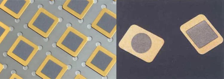 特徴 | コバール(金メッキ有無)、金属、セラミック、ガラス、反射防止ガラス、ゲルマニウム、シリコンなどのリッドに対し、パターニングしたゲッターを成膜したもの。 リッドに直接成膜する為、ゲッター材料の切断、装着、スポット溶接などの作業が不要。 |