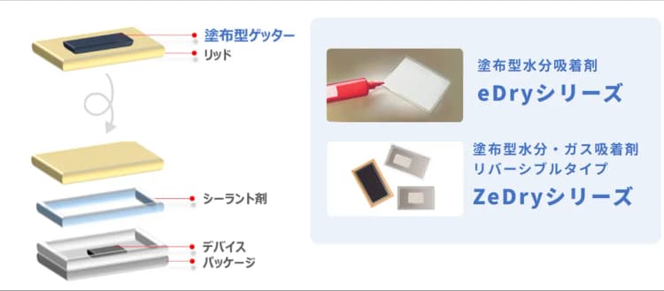 塗布型ゲッター材として、「塗布型水分吸着剤 eDryシリーズ」と、「塗布型水分・ガス吸着剤 リバーシブルタイプ ZeDryシリーズ」がございます。