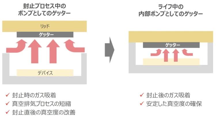 ゲッターを使用することで、封止直後のパッケージ内部圧力の悪化を最小限に抑え、長期安定化させることが可能です。
