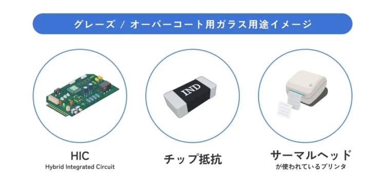 グレーズ / オーバーコート用ガラスは、例えば下記のような用途に使用され、その製品の性能及び信頼性向上に重要な役割を果たしています。
