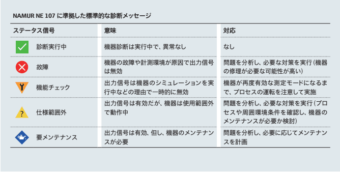 診断メッセージは、NAMUR NE107に準拠し、原因と対策を明確なテキストで提供する標準化されているので、適時、効率的かつ適切な保全を可能にします。