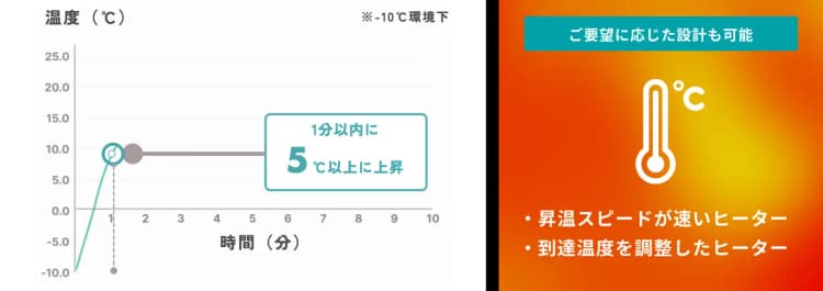 すぐに暖まるため、ガラスなどの透明な⾯に付着した雪や曇りを素早く取り除けます。車載機器においては、1分以内に凍結・着雪を溶かすことが求められますが、シライ電子工業の透明フィルムヒーターであれば、その条件を満たすことができます。こちらの昇温グラフは、-10℃環境下で透明フィルムヒーターが暖まる速度を示した例です。