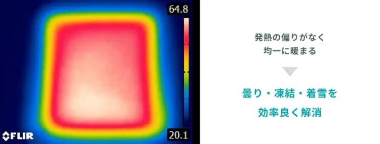 発熱の偏りがなく均一に暖まります。そのため曇り・凍結・着雪を効率良く解消でき、面内が均一にクリアになるため、対象機器の性能や誤動作、動作遅れを防ぐことが出来ます。