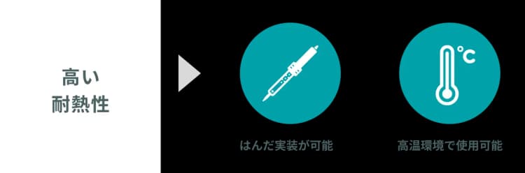 耐熱性が高いため、一般的な基板やFPCと同じように電子部品のはんだ付け実装が可能です(リフロー耐熱180℃)。ヒーター自体が発する熱にも耐えられるため、他社提供の透明フィルムヒーターと比較して、より高い温度まで暖めることができます。また、工場内など高温になりやすい環境でも使用することができます。