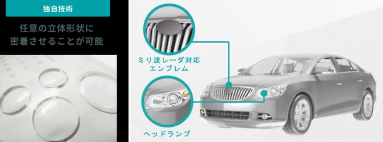 フィルムインサート成形により、透明フィルムヒーターを成形樹脂や加飾フィルムと結合させることができます。この技術により、自動車のヘッドランプやミリ波レーダ対応エンブレムなど、立体的な形状に合わせた透明フィルムヒーターを実現できます。また、透明フィルムヒーターは、曲面へ貼り付けても均一に暖まります。