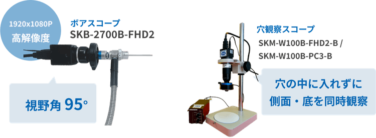 穴観察スコープは、HDMI接続タイプのSKM-W100B-FHD2-Bと、USB3.0接続タイプのSKM-W100B-PC3-Bをご用意しています。カメラを穴の中に入れなくても、モニタ画面やパソコンで穴の側面および底の同時観察が可能です。