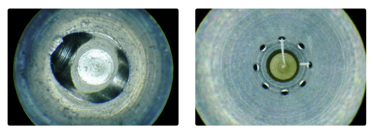 ボアスコープSKB-2700B-FHD2で撮影したサンプル画像です。穴内部の観察に際して、対象物を斜めに傾けたり、ミラーを使用することなく簡単に、高画質の映像で穴の底部および側面の同時観察が可能になります。