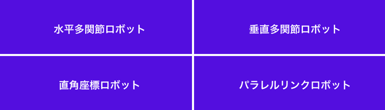 産業用ロボットには多くの種類があり、軸の数や取り付けるアームによって得意な作業がそれぞれ異なります。代表的なものとして「水平多関節ロボット」「垂直多関節ロボット」「直角座標ロボット」「パラレルリンクロボット」のそれぞれの特徴を以下にご紹介します。