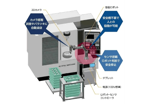 | マシンテンディング・パッケージ | 協働ロボットが、ヒトにかわって加工機(NC、旋盤、プレス機、EDMなど)へのワーク投入、取り出しを行います。 |