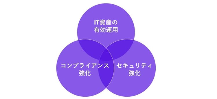 IT資産管理の目的は様々ありますが、「運用」「コンプライアンス強化」「セキュリティ強化」に分けてご紹介します。
