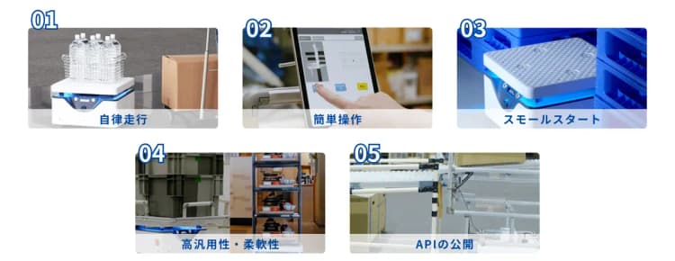 KeiganALIは「設定が簡単」で1台から導入可能な「スモールスタート」ができる自律移動ロボットです。以下の5つの特長を有し、その高いカスタマイズ性により、さまざまなシーンでご利用いただけます。
